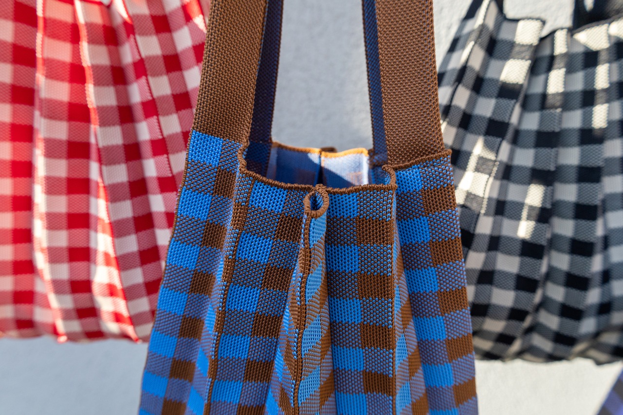 ニット素材ならではの柔らかな表情に、端正なギンガムチェックを掛け合わせたデザインバッグ。